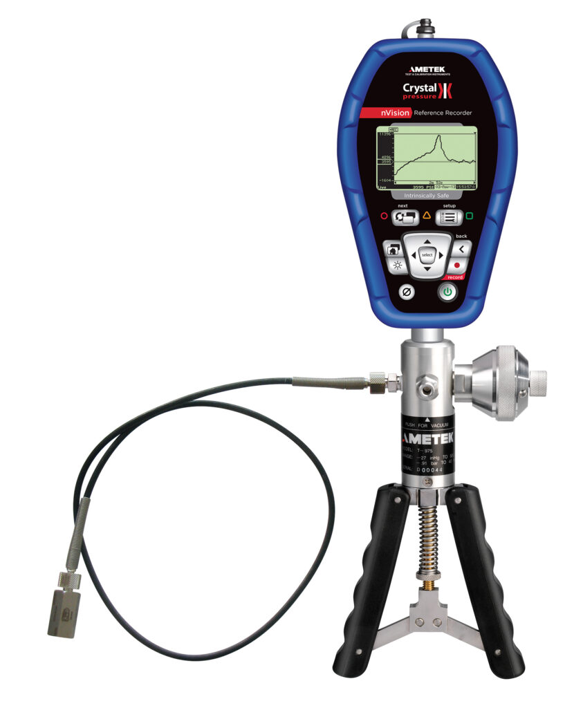 nVision Pressure Calibrator is an intrinsically safe, hand-held device for generating and recording pressure up to 8 Bar A (100 psi / 7 Bar R). It is accurate enough to replace a dead-weight tester and portable enough to complete pressure calibrations anywhere.
